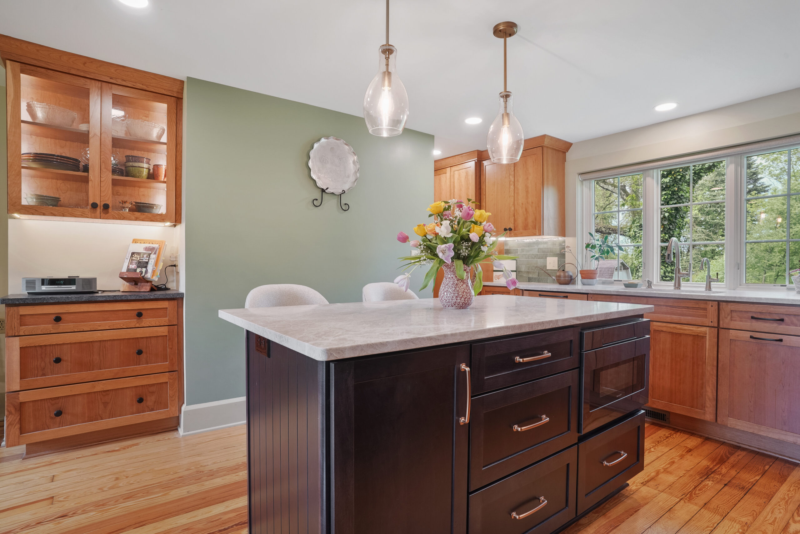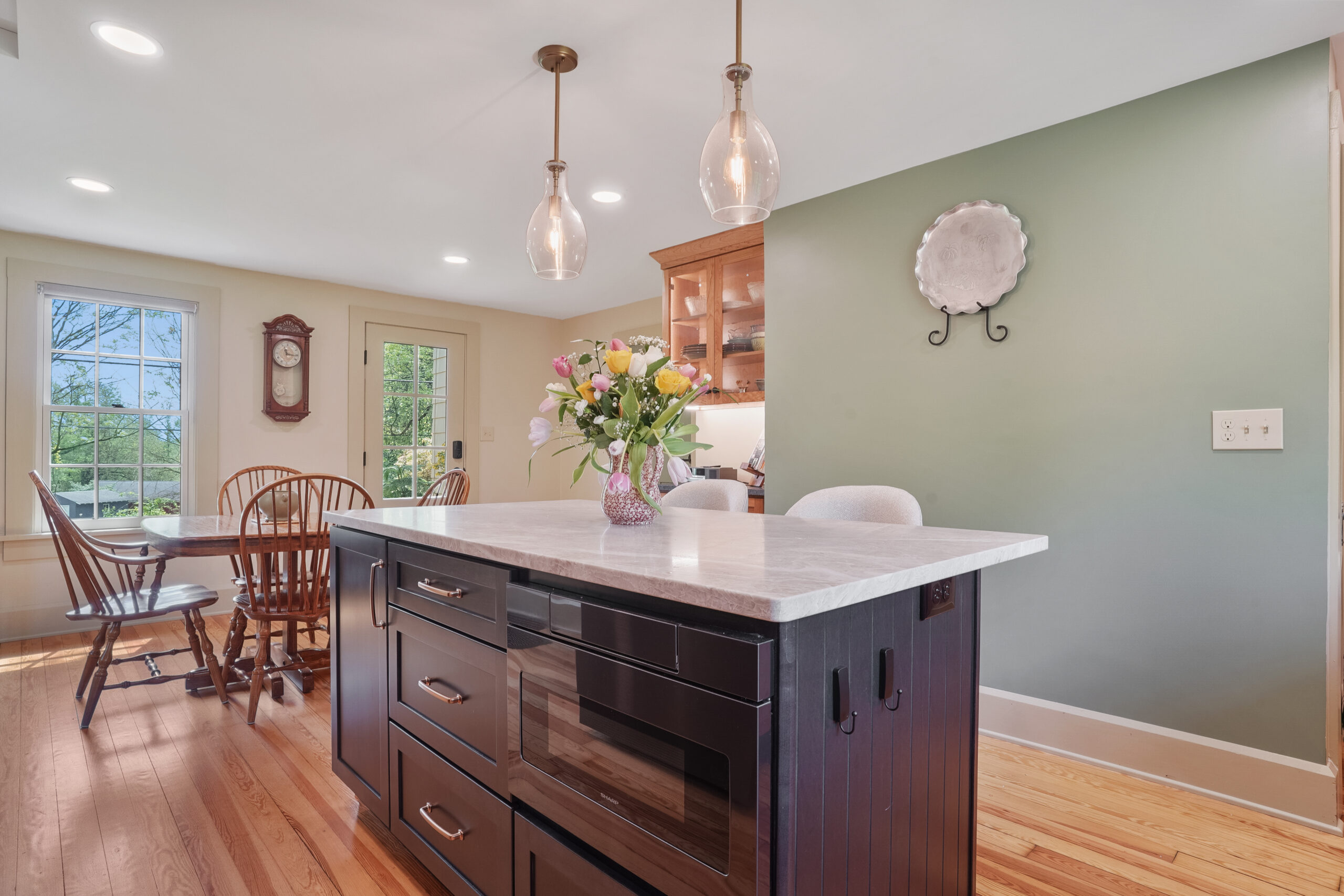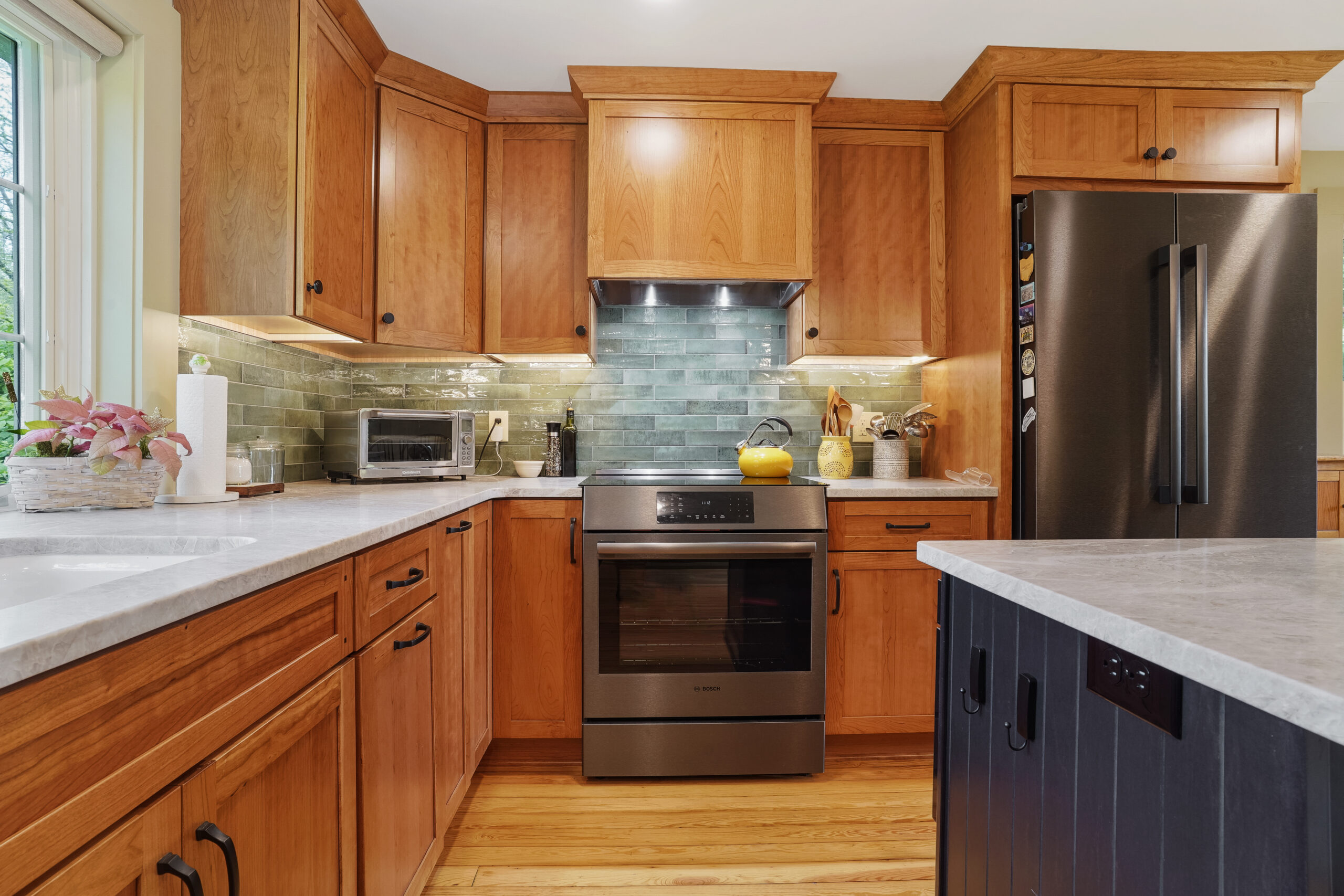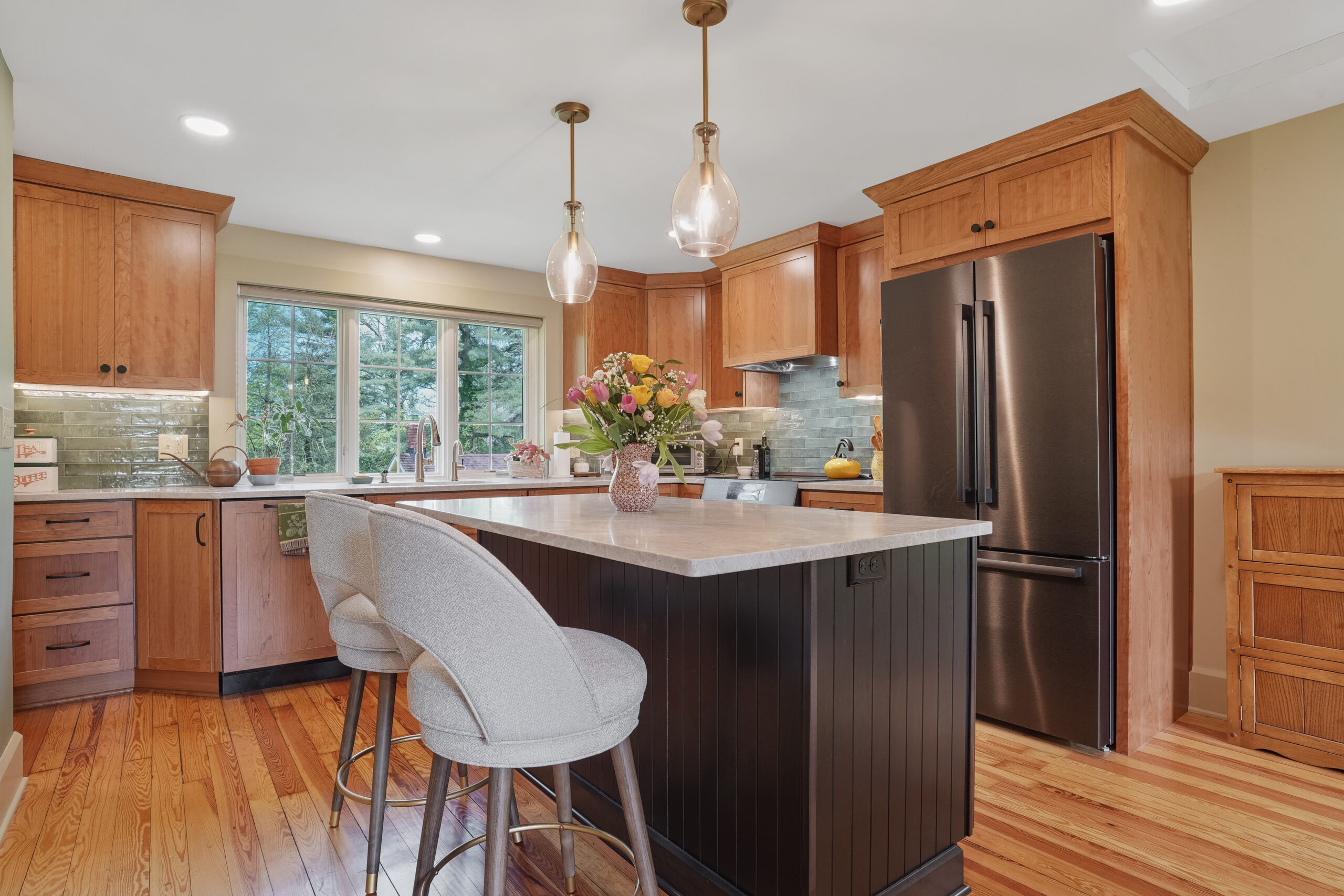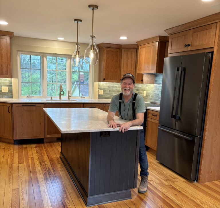 This homeowner wanted to lighten up their kitchen space by adding recessed lighting the ceiling and under cabinet lights along the countertop areas with accent lighting in the hutch.  The raised panel custom cabinetry continues on the refrigerator and dishwasher to hide the appliances.