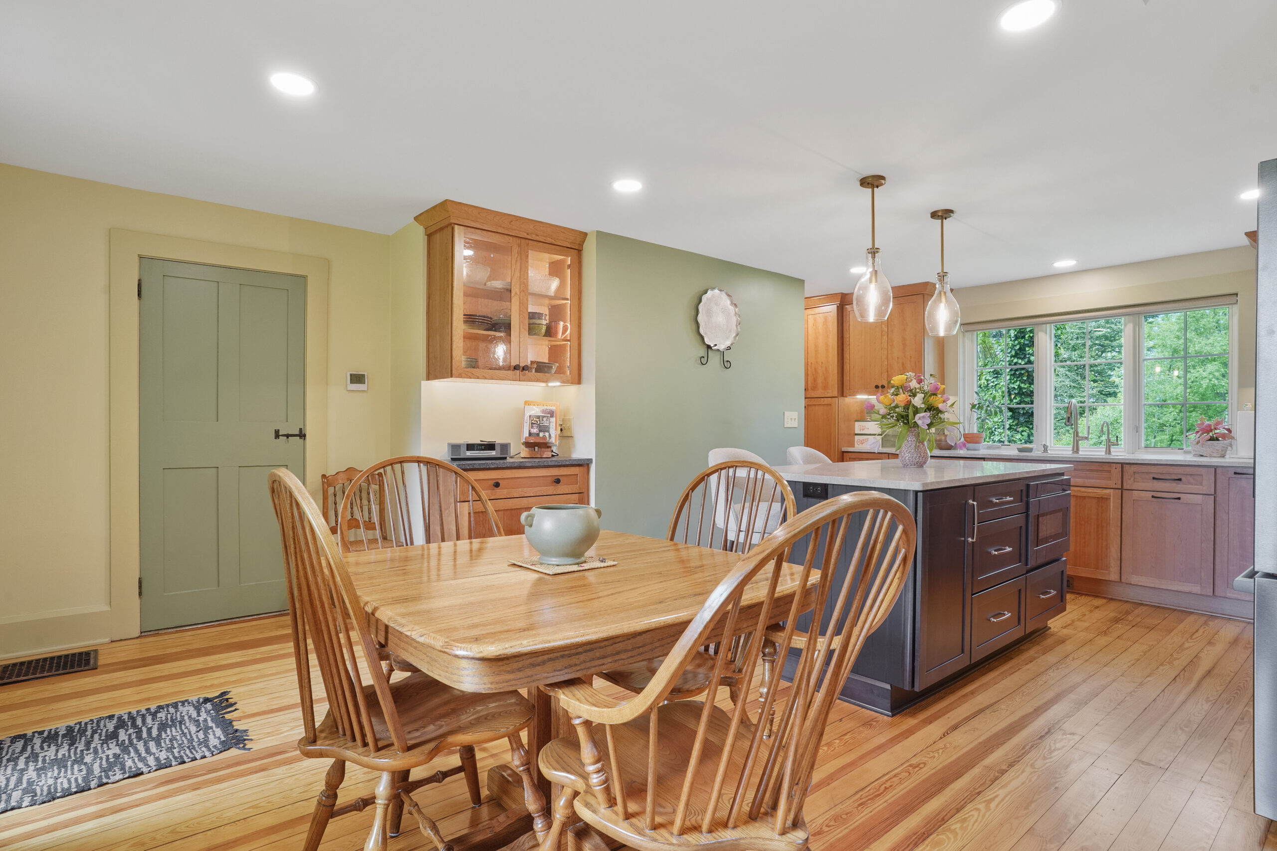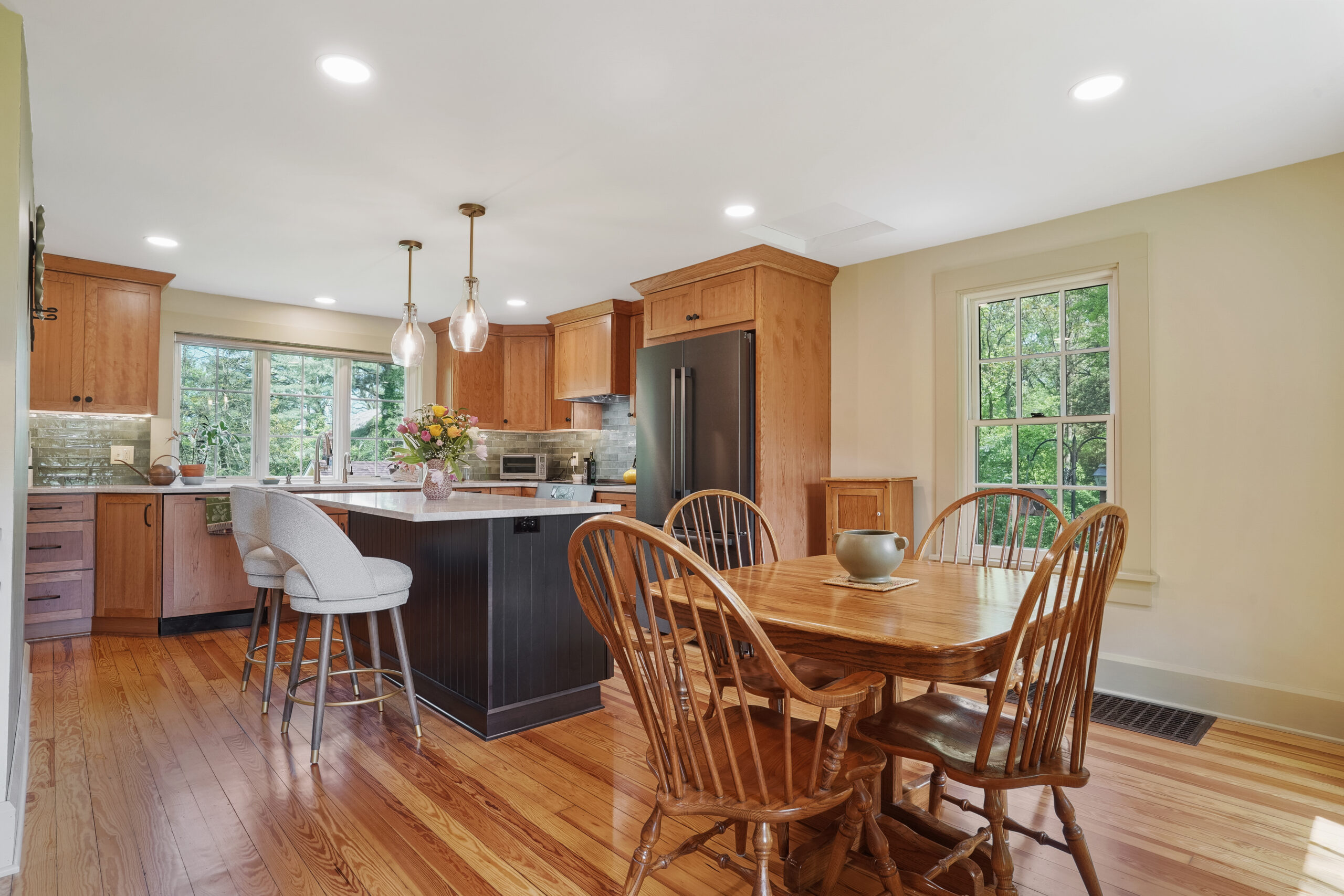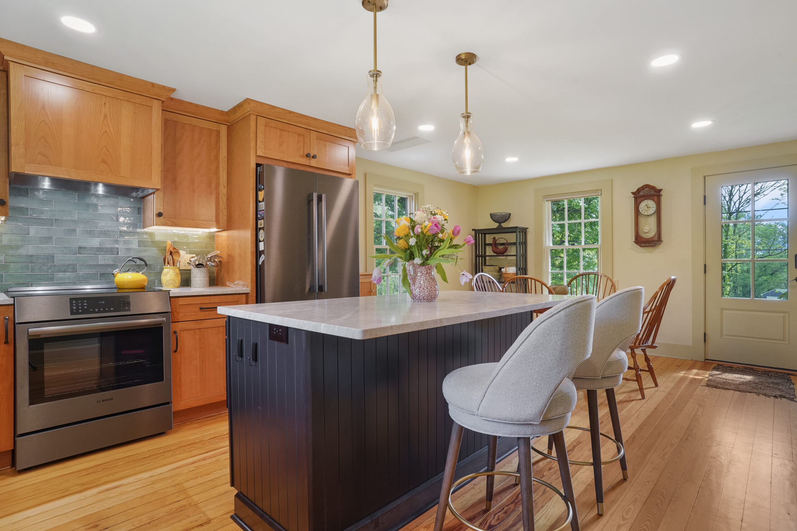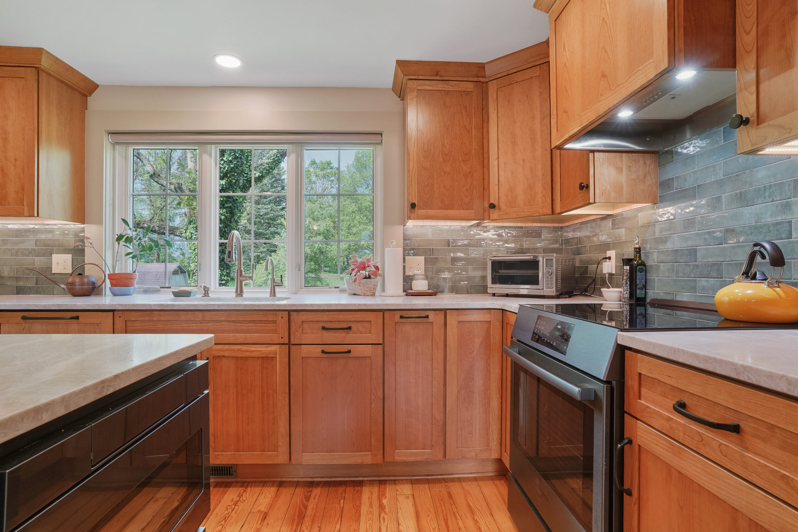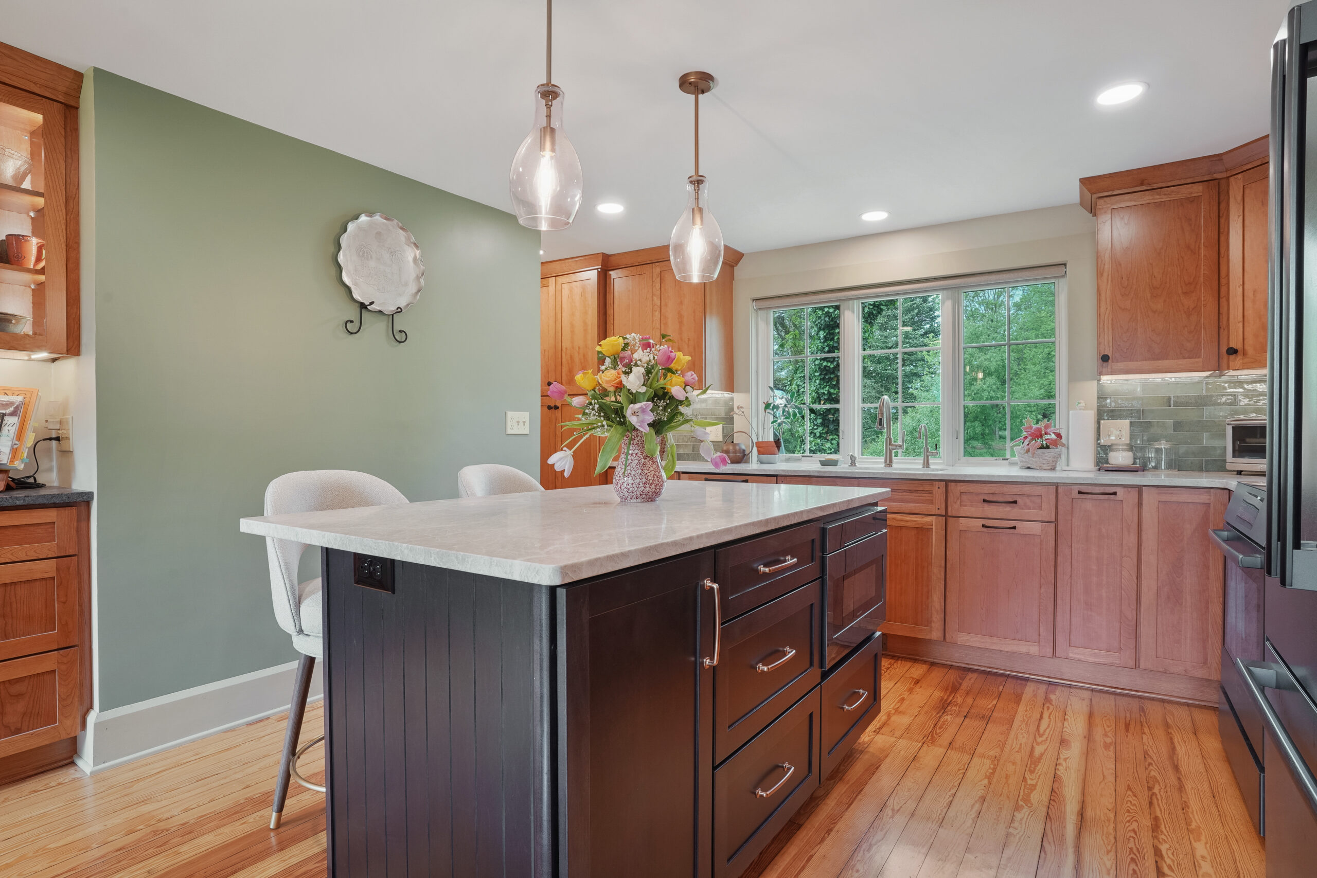 This homeowner wanted to lighten up their kitchen space by adding recessed lighting the ceiling and under cabinet lights along the countertop areas with accent lighting in the hutch.  The raised panel custom cabinetry continues on the refrigerator and dishwasher to hide the appliances.